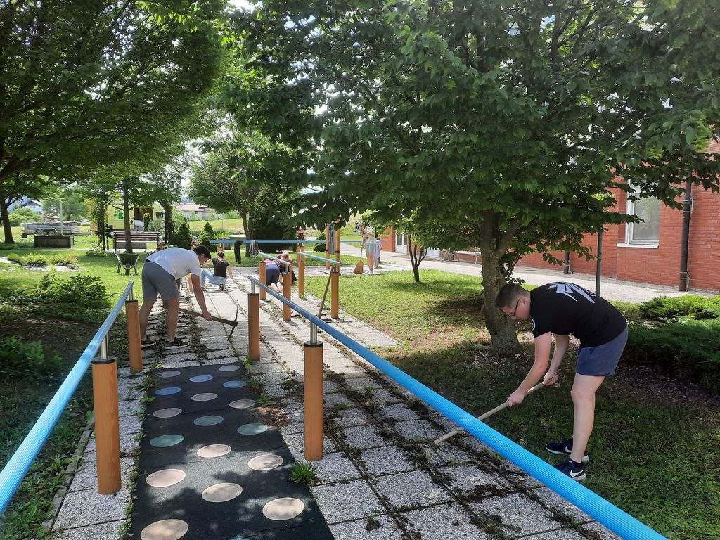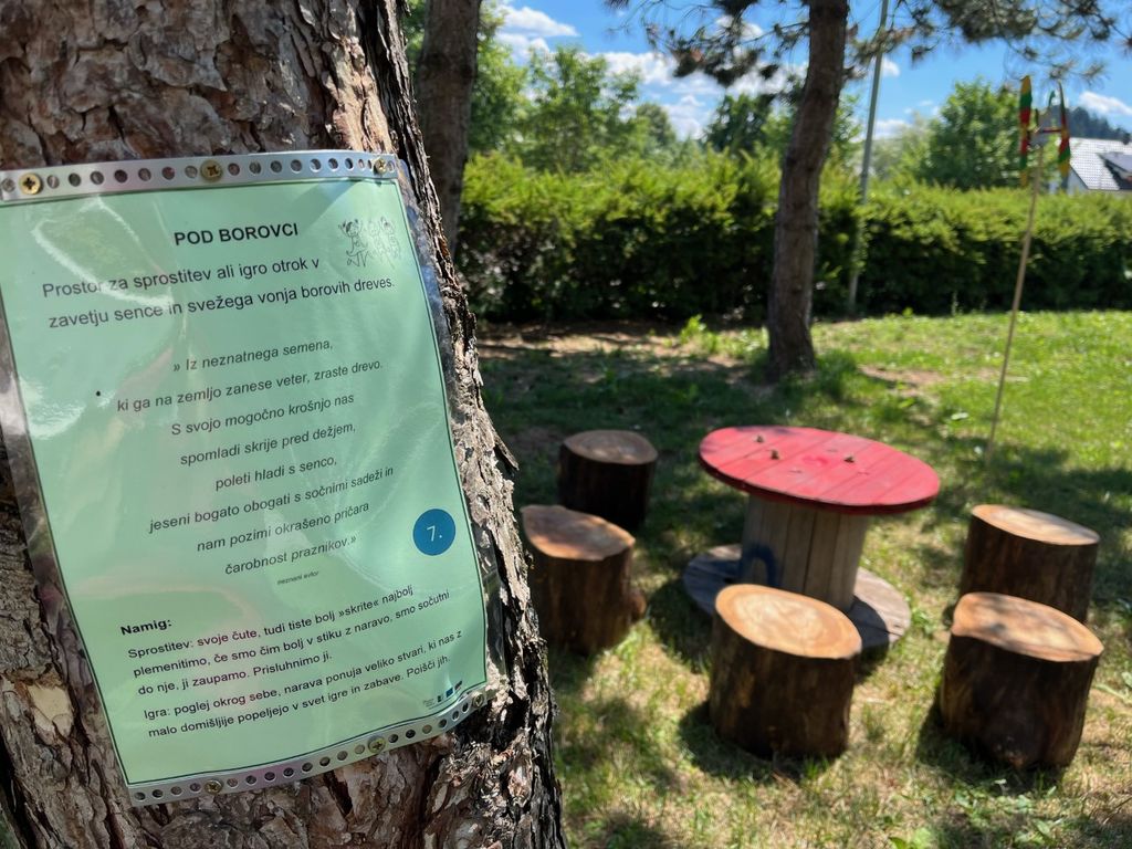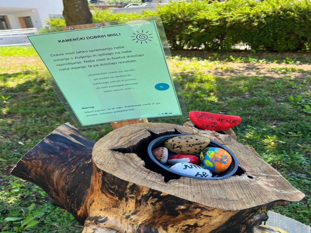 Najpomembnejši del projekta je bila postavitev čutne poti v domskem parku. Poimenovali smo jo Narava naša zdraviteljica. Namenjena je krepitvi čutov, ohranjanju gibalne spretnosti, sprostitvi, obujanju domišljije in igrivosti. Uporabili smo darove narave, ki nam omogočajo številne dražljaje, s katerimi obudimo vse naše čute. Nasadili smo zelišča in dišavnice, ki zbudijo vonj in okus. V dvižne gredice posadili nekaj zelenjave, da bomo še naprej »brkljali« po zemlji in se veselili skromnega pridelka. Iz naravnih materialov je nastal prostor za obujanje tipnih dražljajev, igra ogledal pričara očem prijetno svetlobo. Da bo vrt izžareval še več pozitivnosti smo pobarvali kamenčke za prebujanje dobrih misli in jih postavili v lepo deblo. Manjkati ne sme tudi igrivost, s katero ohranjamo mladostnost in nagajivost. V park smo postavili družabne igre »voukalca«, križec in krožec ter rusko kegljišče.