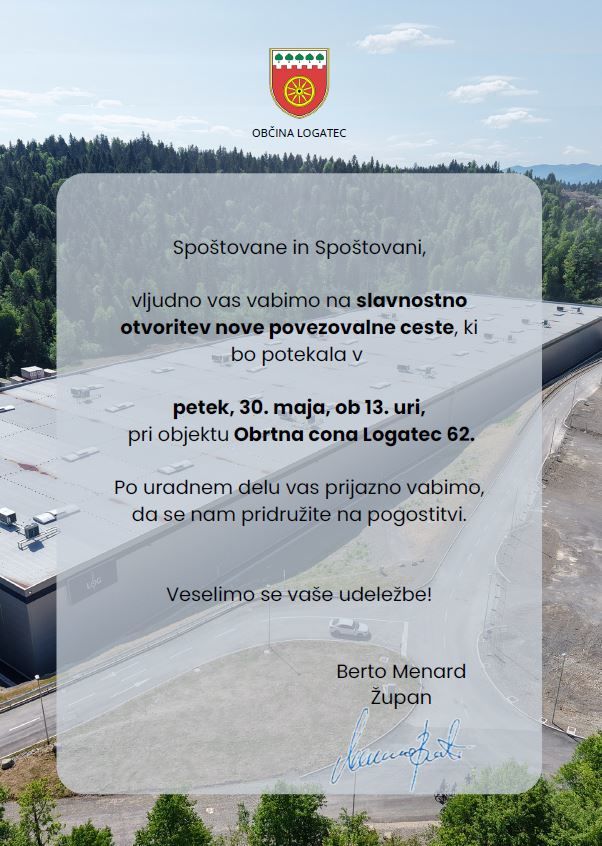 obveščamo vas, da bo slavnostna otvoritev nove povezovalne ceste, ki je bila sprva načrtovana za četrtek, 22. maja 2025, preložena zaradi neugodnih vremenskih razmer.