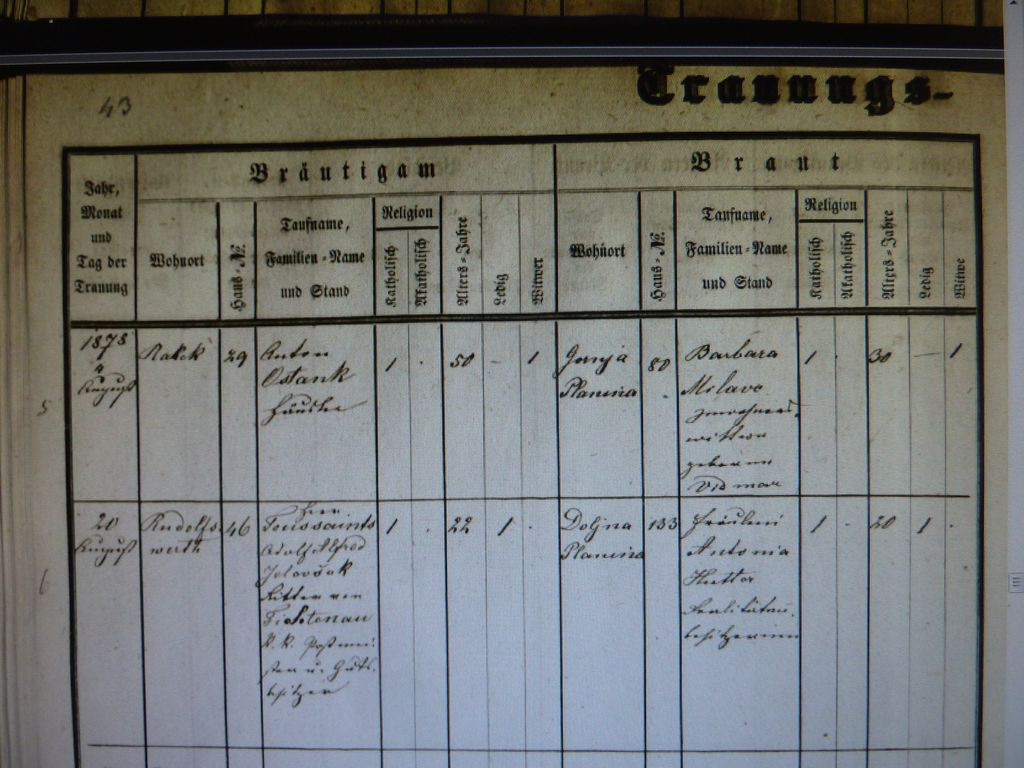 3. Zapis o sklenitve zakona med Antonijo Hutter in Toussaintom Jellouschek pl. Fichtenau ml. iz Poročne matične knjige župnije Planina pri Rakeku 1855‒1895 (NŠAL)