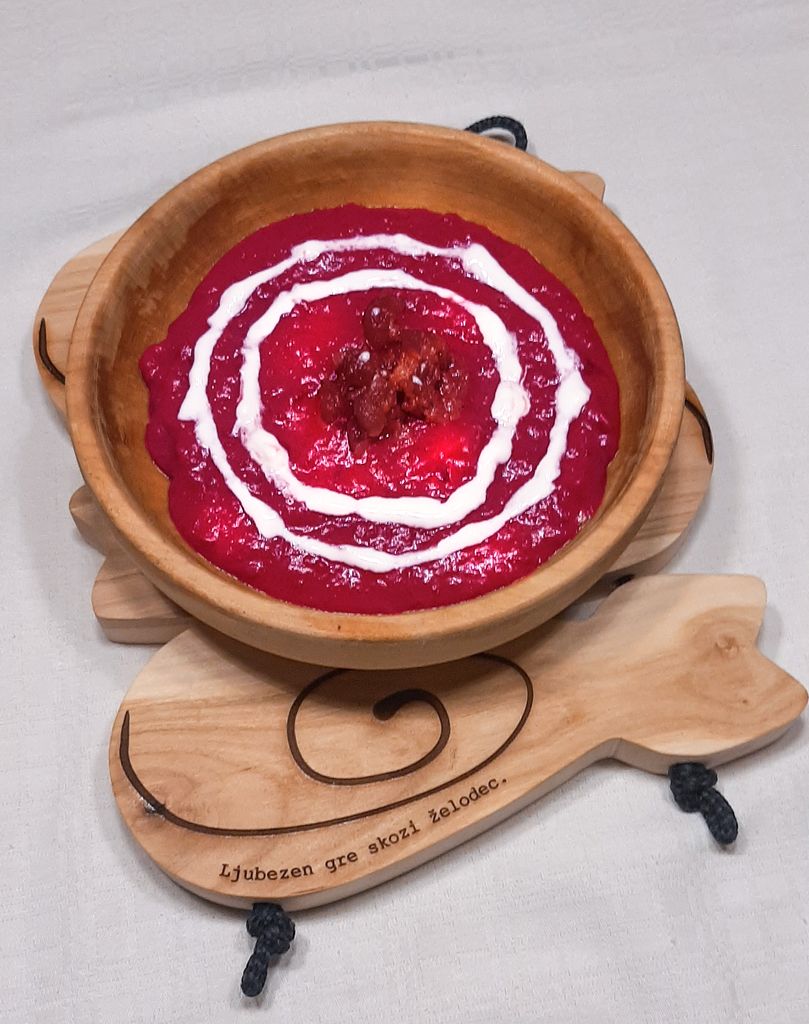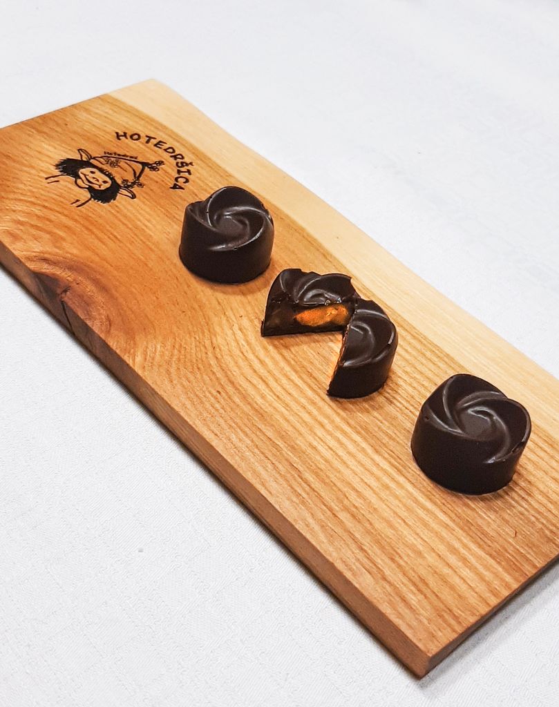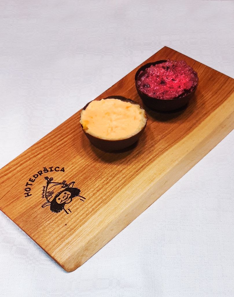 Obrok lahko začnemo z MUŠJO JUHO IZ RDEČE PESE. Pravi, da če nam je zmanjkao suhih muh lahko dodamo ocvirke. Sledi sladica HOTEDRAŽEVE PRALINE ali pa ČOKOLADNE ČAŠICE. V čokoladne praline je ujet nadev iz kolerabe ali pa iz rdeče pese. Čokoladne čašice pa nam že na prvi pogled razkrijejo vabljivo kremo, ki kar vabi po naslednjem grižljaju.