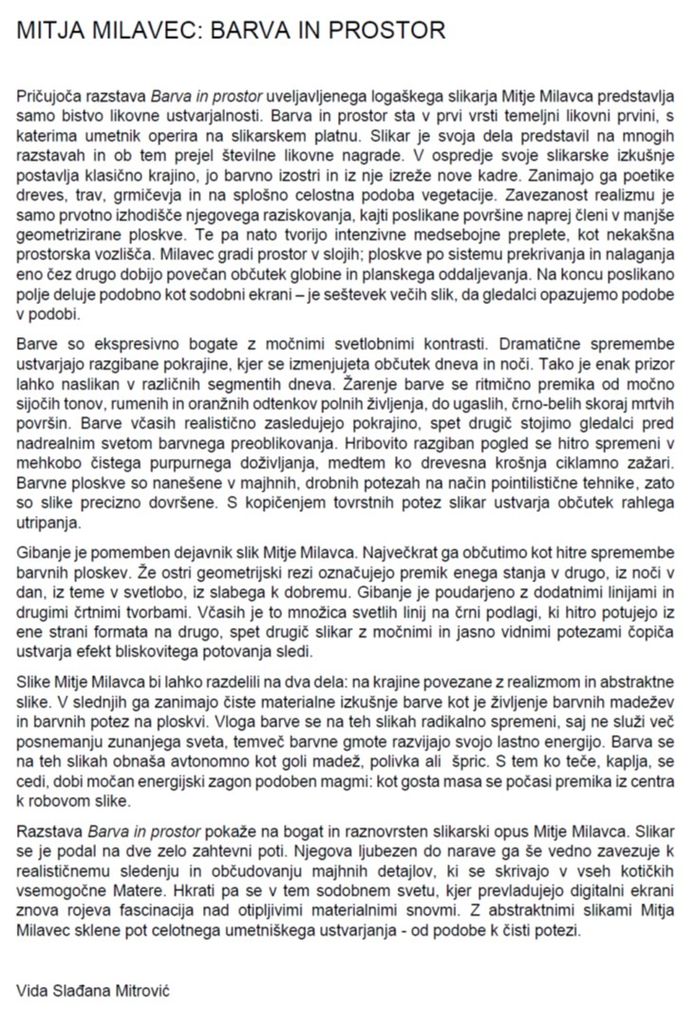 V Galeriji hiša sonca Logatec je v mesecu aprilu 2025, v organizaciji Območne izpostave JSKD Logatec, razstavljal Logatčan Mitja Milavec. Avtor je na svoji deseti samostojni razstavi z naslovom BARVA IN PROSTOR postavil na ogled izbor najnovejših slik iz zadnje nastale serije. Ob odprtju je dr. Vida Slađana Mitrovič, akademska slikarka in pedagoginja predstavila in podrobno obrazložila razstavljena likovna dela, za katere je značilno prepletanje realizma in abstrakcije in postopno prehajanje v čisto abstraktni likovni izraz.