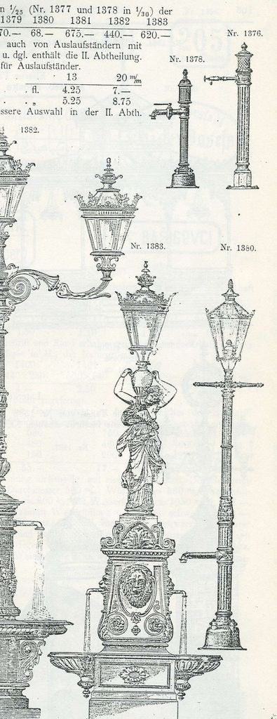Ne glede na obliko podstavka, ki je lahko piramidast ali zvonast, na vrhu vedno stoji ženska figura v kontrapostu. Na vrhu amfore, ki jo nimfa pridržuje na rami, je bila lahko nameščena še svetilka, tako je bilo v Šmarjeških Toplicah. Gre za izdelke Salmove livarne v Blanskem na Moravskem, kjer so s proizvodnjo litoželeznih vodnjakov začeli v 2. polovici 19. stoletja in nadaljevali do prvih desetletij 20. stoletja; naročiti jih je bilo mogoče po katalogu. Livarna je imela svoje agencije tudi na Dunaju in v Gradcu.