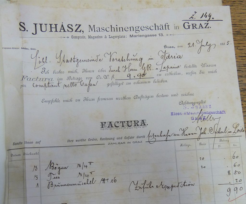 Kot je znano, je bil za napeljavo vodovoda v Logatcu med najzaslužnejšimi posestnik in trgovec s Čevic Ivan (Johann) Sicherl, takrat tudi dolnjelogaški župan. Na fakturi (hrani Zgodovinski arhiv Ljubljana, Enota v Idriji), poslani iz Gradca v Idrijo 21. julija 1885, pa vidimo, da je poslovno sodeloval tudi z Juhászom, in sicer je bilo naročilo izvršeno preko Sicherla (Ihre werthe Ordre, Rechnung und Gefahr durch […] an Herrn Joh. Sicherl in Loits[ch]).