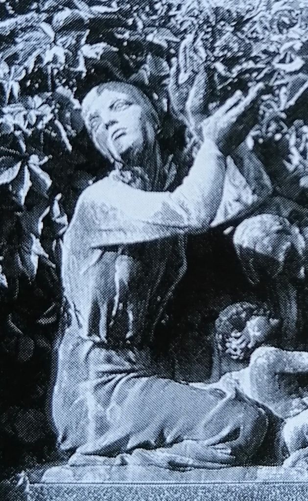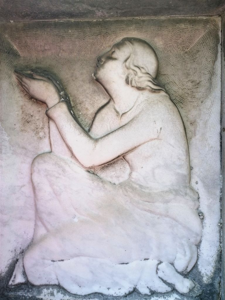 Dodatno zanimivo je dejstvo, da Kalin za Gostišev spomenik ni uporabil novega materiala, pač pa fragment starejšega nagrobnika. Na hrbtni strani marmornega vložka z reliefom je namreč vklesan napis, ki omenja Frančiško Bradaška, roj. Černe, ki je umrla leta 1918 in je bila žena ljubljanskega mestnega blagajnika v pokoju Ferdinanda Bradaške. Ta je bil tudi prvi blagajnik Društva za zgradbo zavetišča in vzgajališča v Ljubljani, na čelu katerega so bili pomembni in ugledni možje. Omenimo vsaj podpredsednika, namreč stolnega kanonika in župnika Janeza Flisa, ki je leta 1885 izdal prvo slovensko knjigo o zgodovini arhitekture, Stavbinski slogi: zlasti krščanski, njih razvoj in kratka zgodovina z dodatkom o zidanji in popravljanji cerkva, eden od dveh tajnikov društva pa je bil tudi že omenjeni Ivan Šubic.