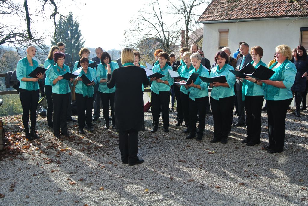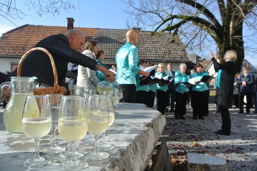 V nekdanji vaški šoli, kjer se je rodil Marko Bajuk, klasični filolog, glasbenik in organizator slovenskega šolstva si je zbor ogledal razstavo, v kleti pa je zborov gostitelj Toni Vinopivec, ki nadaljuje zgodbo vinarstva Dolc (v Hotedršici ima vinotoč!) zbranim predstavil zgodbo soseske zidanice, večstoletne vaške tradicije. Kako lahko homogena vaška skupnost deluje v dobro članov tudi tedaj, ko so časi neprijazni, kako se zmorejo ljudje vzeti skupaj in biti v oporo sočloveku v stiski, kako osmisliti in poskrbeti za skupne potrebe vasi …! Občudovanja in posnemanja vredno tudi dandanašnji dan. Povedal nam je še, kaj pomeni vzeti »na (svoj) rovaš«. Pridite v Drašiče in se o tem poučite tudi sami. Gostoljubni so in pozorni do vsakogar.