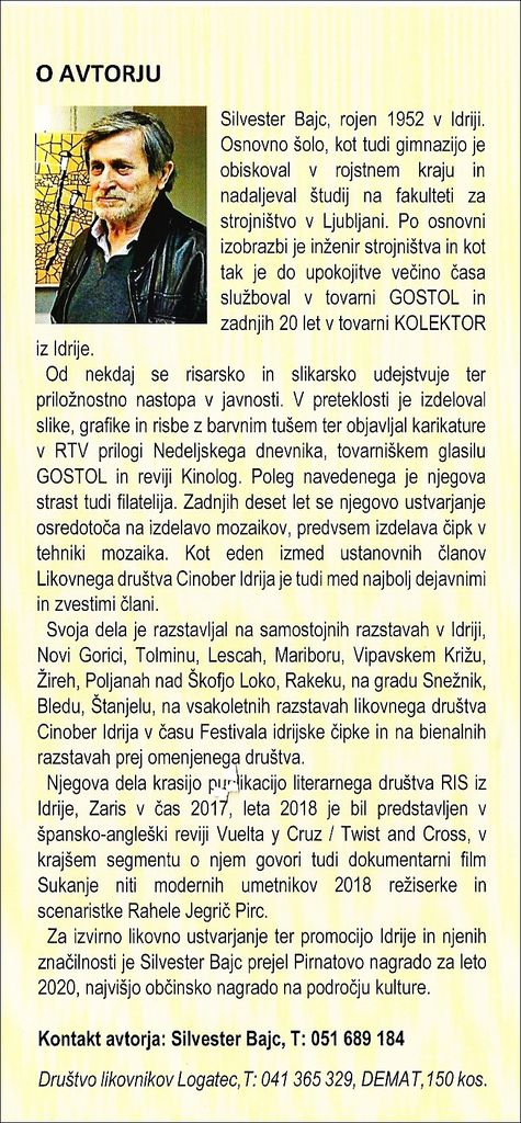 Silvester Bajc ustvarjalna dejanja uresničuje v mozaiku, v tej posebni umetniški disciplini.