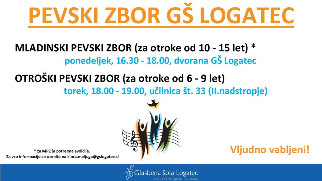 Mladinski pevski zbor bo deloval pod okriljem Klare Mlajuga in je namenjen otrokom in mladostnikom v starosti od 10–15 let. Za slednjega je potrebno opraviti tudi avdicijo. Za vse informacije se obrnite na: klara.maljuga@gslogatec.si.