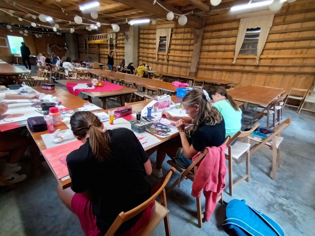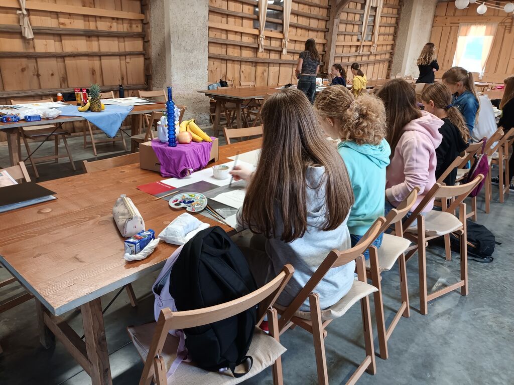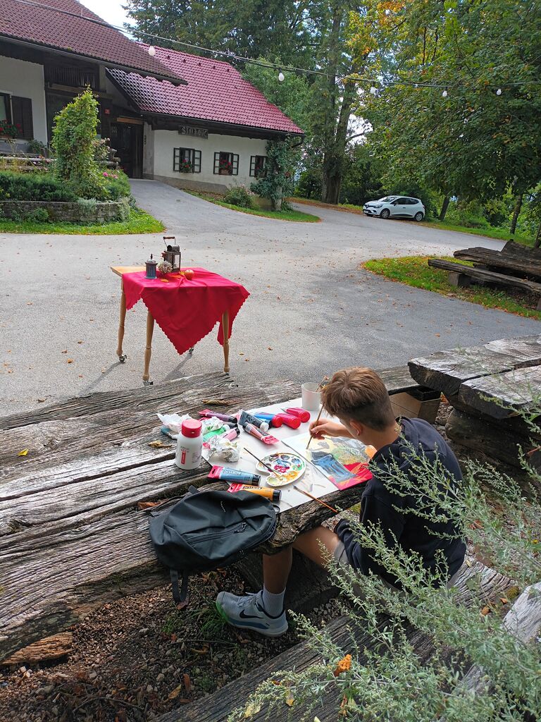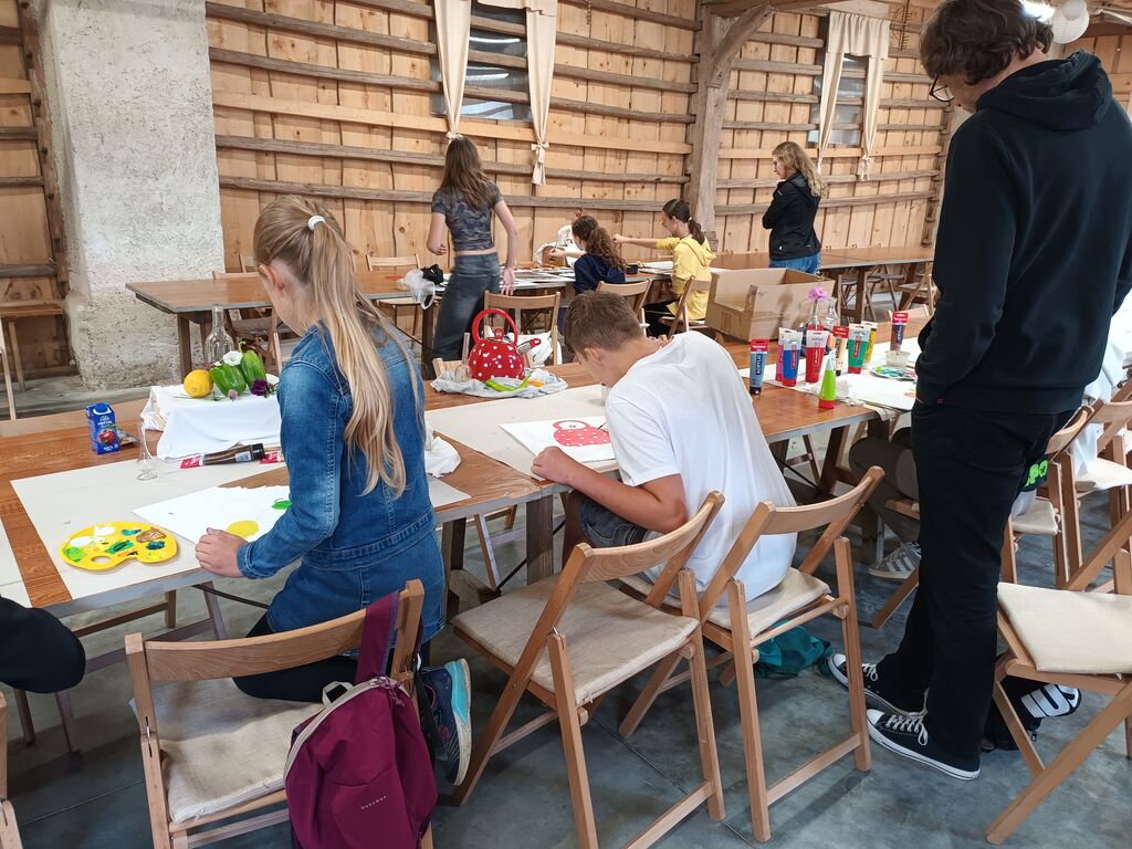 Delo je potekalo v zbranem, ustvarjalnem vzdušju in veliko bolj samostojno, kakor v šoli. Slikali so tihožitja v akrilni tehniki. Med ponujenimi predmeti so samostojno izbrali poljubne vaze, svetilke, blago, sadje, zelenjavo, cvetje… iz katerih so sestavili več različnih tihožitij in naslikali vsak svoj izbrani motiv. Pri tem niso posnemali realističnih barv opazovanih objektov ampak so iskali ravnovesje oblik in tonskih harmonij ali barvnih kontrastov. Preizkusili so novo slikarsko tehniko, delo z akrilnimi barvami je drugačno od slikanja s tempero, ki jo uporabljajo v šoli. Dodaten izziv je predstavljal tudi kvadratni format na katerem je težje ustvariti uravnoteženo kompozicijo likovnih elementov. Tako so izkusili večjo samostojnost v celotnem procesu ustvarjanja, od same izbire in priprave motivov do preizkušanja novosti. Pomembno je, da so imeli na razpolago dovolj časa v katerem so slike lahko tudi dokončali, mentorji pa so jim pri tem pomagali z nasveti in usmeritvami. V zbranosti in delovni vnemi je dan hitro je minil, ob koncu so se razšli zadovoljni in odnesli s seboj vtise nepozabnega doživetja.