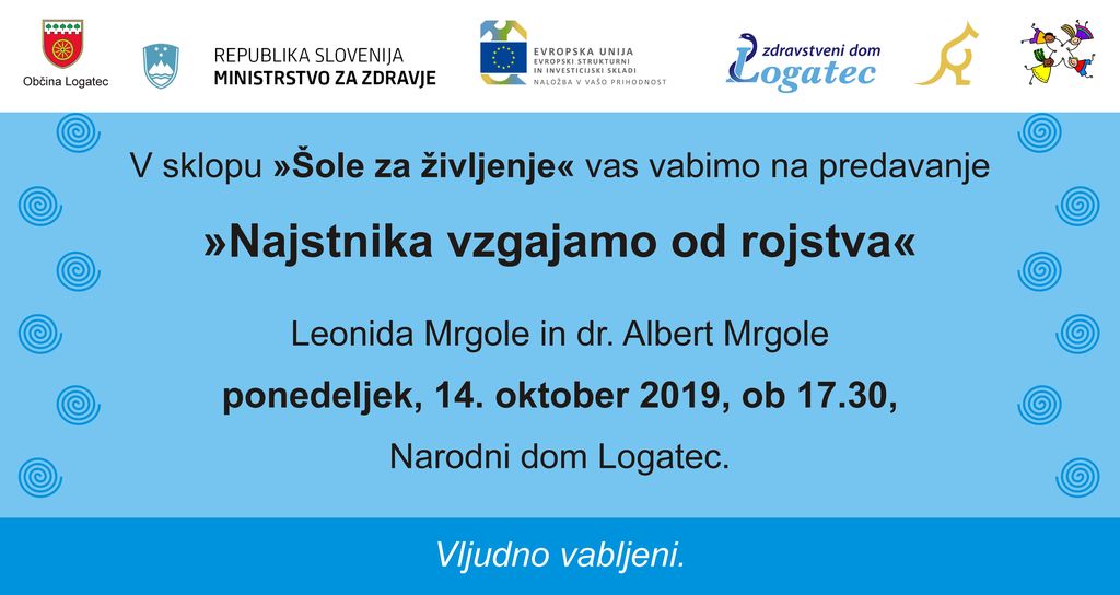 Vabimo vas, da se nam v ponedeljek, 14. oktobra 2019, ob 17.30 pridružite v Narodnem domu Logatec na predavanju dr. Alberta in Leonide Mrgole - Njastnika vzgajamo od rojstva.