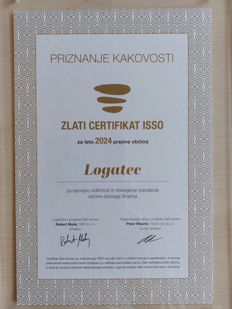 Občina Logatec je prejela Certifikat ISSO Zlati kamen, ki ga pridobijo občine, ki ponujajo prebivalcem kakovostno raven življenja in jih odlikuje solidna ter uravnotežena stopnja doseženega razvoja.