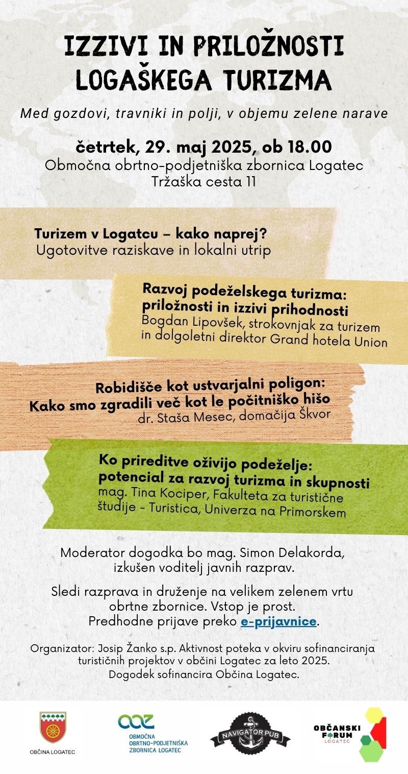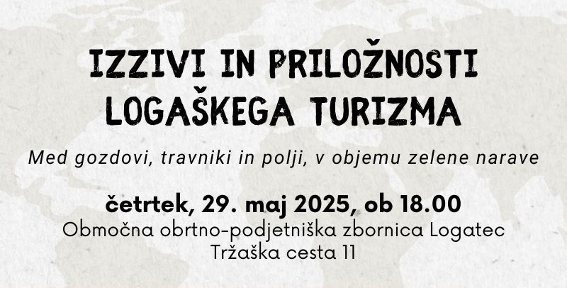 Vabljeni na strokovni posvet »Izzivi in priložnosti turizma v Logatcu«, ki bo v četrtek, 29. maja 2025 ob 18h na Območni obrtno-podjetniški zbornici Logatec, Tržaška cesta 11.
