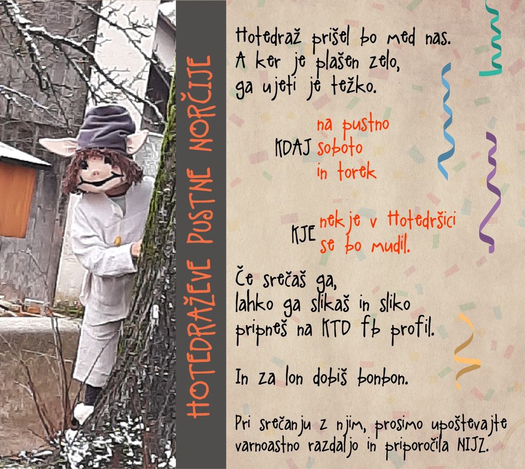 Pravi, da bo zelo pgumen to pustno soboto in na pustni torek, ko se bo opogumljen sprehajal po Hotedršici. Prav rad se bo fotografiral s tabo. Pa še bonbon dobiš za lon.