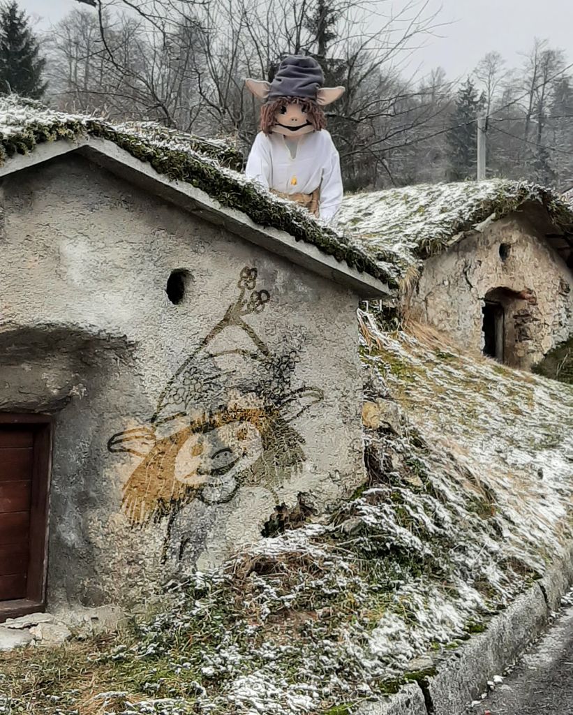 Škrat Hotedraž je v teh dneh še posebej radoživ. Nič več se ne skriva v zemljankah in samo na skrivaj požgečka mmoidoče.... Prav spretno se suče po vasi in tudi dovoli fotografiranje.