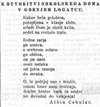 [25] Albin Čebular, K otvoritvi sokolskega doma v Logatcu, Domovina, št. 28, 12. 7. 1928, str. 10.