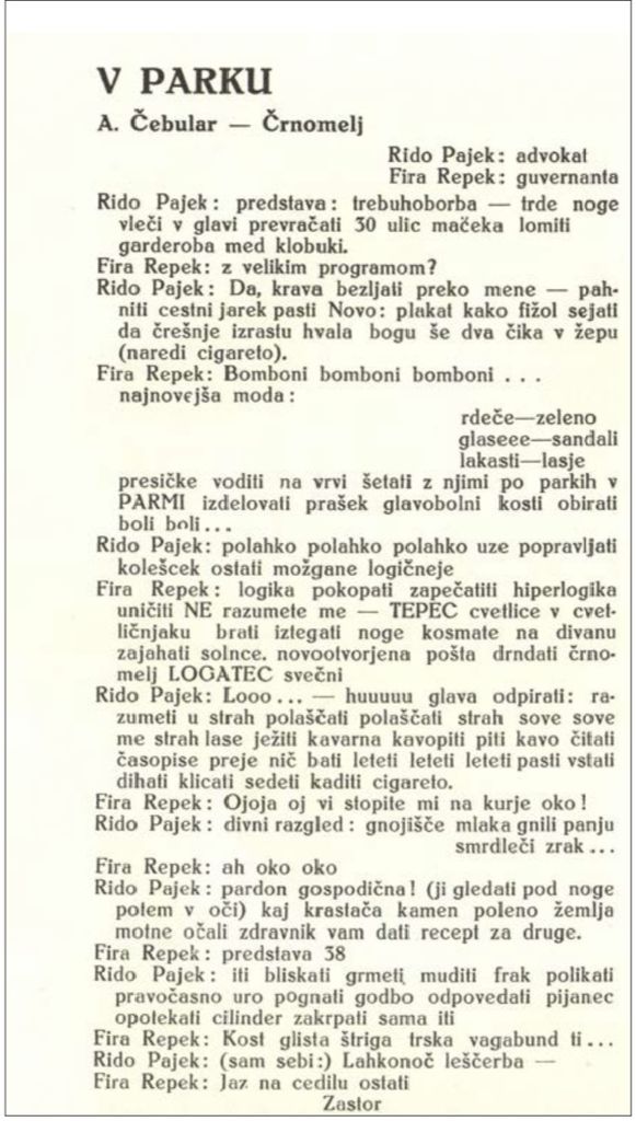 Na Čebularjev pomen na področju avantgardnega ustvarjanja je pred kratkim opozoril Marijan Dović. Junija 1922 je Čebular namreč objavil modernistični dramski dialog V parku, edini slovenski literarni prispevek v Zenitu, ki velja za najuspešnejši jugoslovanski avantgardni časopis.[18] Omeniti velja, da je zenitizem na začetku izhajal zlasti iz (zapoznelega) ekspresionističnega utopizma in delno futurističnega dinamizma, ki jima je sinkretično dodajal posamezne elemente drugih gibanj.[19]
