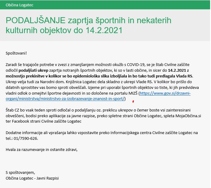 Podaljšanje zaprtja športnih in nekaterih kulturnih objektov do 14. 2. 2021