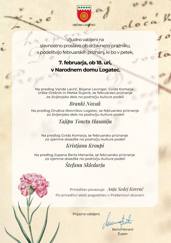 Vabilo na proslavo Občine Logatec s podelitvijo februarskih priznanj, 7. 2. 2025, ob 18. uri, Narodni dom Logatec