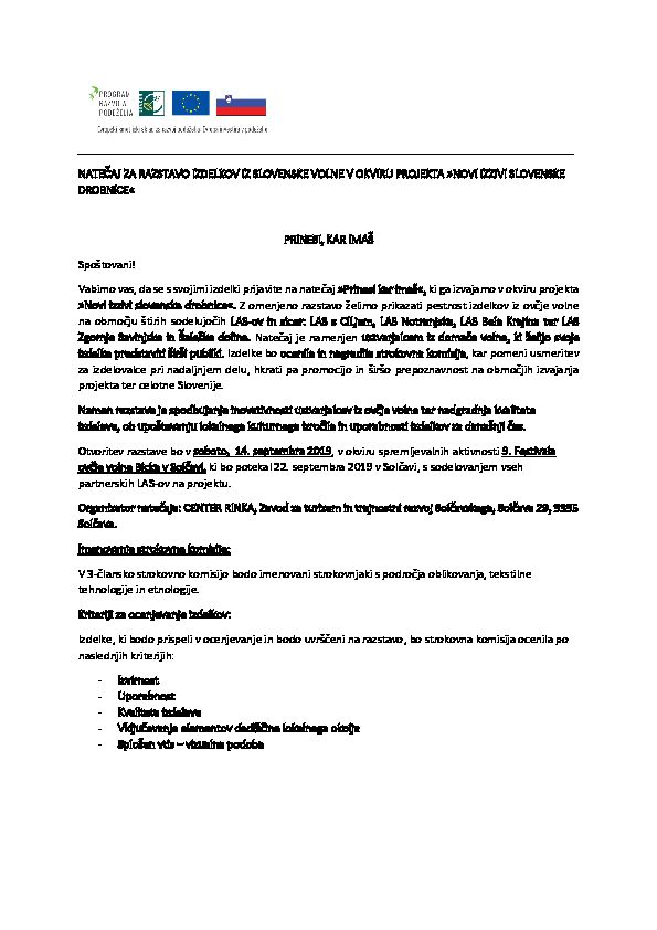 Z natečajem rokodelskih izdelkov »Prinesi kar imaš« bomo v skupno razstavo združili kvalitetne izdelke ustvarjalcev iz območja vseh štirih vključenih LAS-ov, LAS s CILjem, LAS Notranjska, LAS Bela Krajina in LAS Zgornje Savinjske in Šaleške doline.
