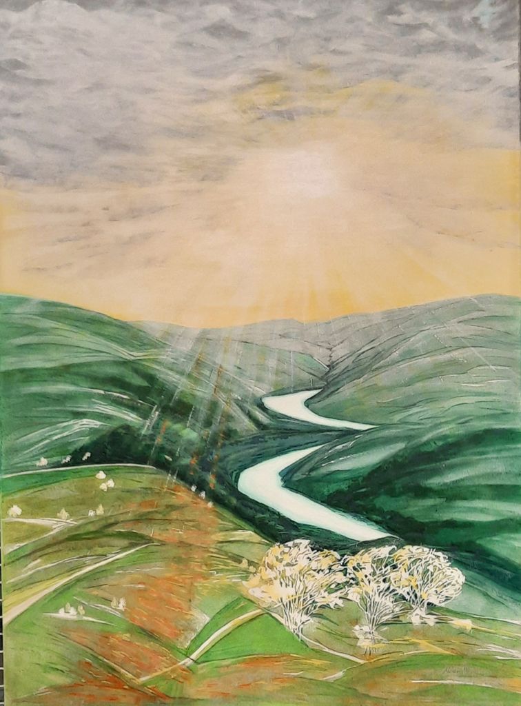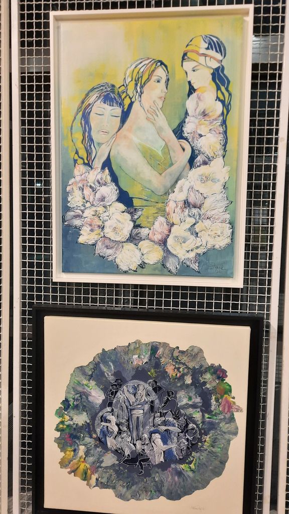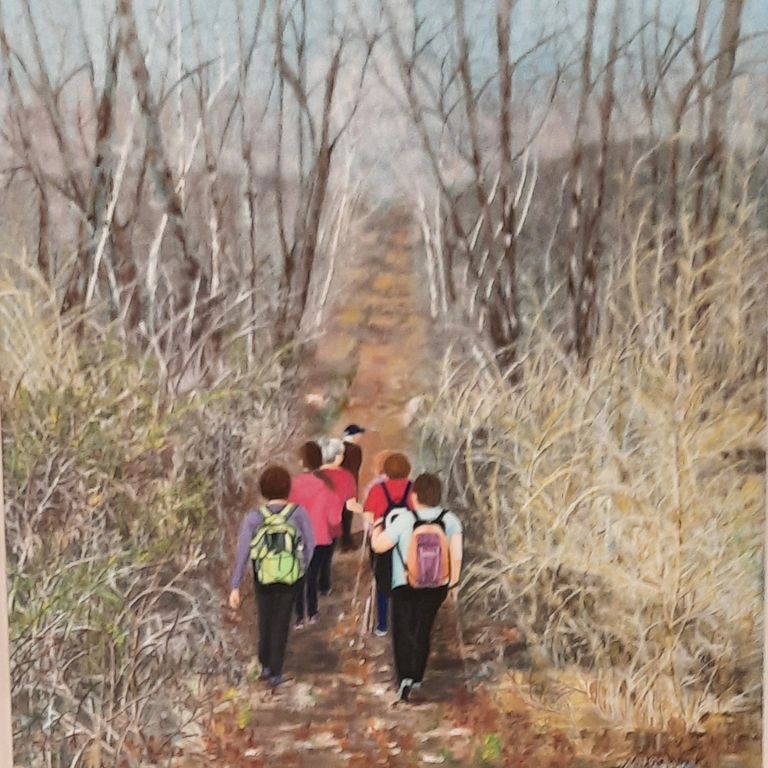 Sliko z naslovom Objemi objemajo mehka barvna prelivanja, samo jedro pa oblikuje kompozicija skupine ljudi. To so portretne upodobitve njenih najdražjih. Utelešeni so z risbo, ki eksaktno in prefinjeno sledi telesnim danostim posameznika ter izrazno močnim obrazom.