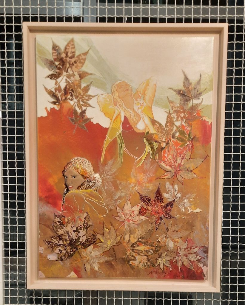 Ponovno rojstvo predstavlja domiselno kombinacijo ženskih figur z barvitimi drevesnimi listi.