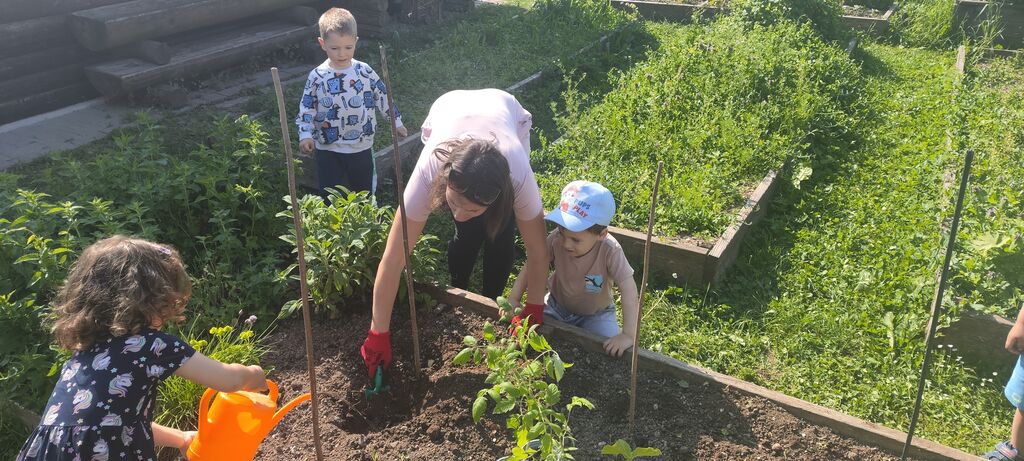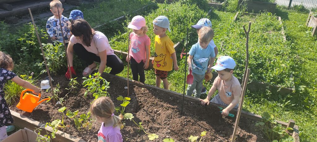 Na nekaj visokih gredah, ki so postavljene v kotu na igrišču vrtca, otroci s pomočjo vzgojiteljic (na pomoč pa priskočijo tudi hišniki) sadijo, zalivajo in opazujejo rast zelenjave, zelišč in rož ter pobirajo pridelke. Z veseljem vrtnarijo in se učijo dela z zemljo ter si tako oblikujejo pozitiven odnos do narave in hrane.