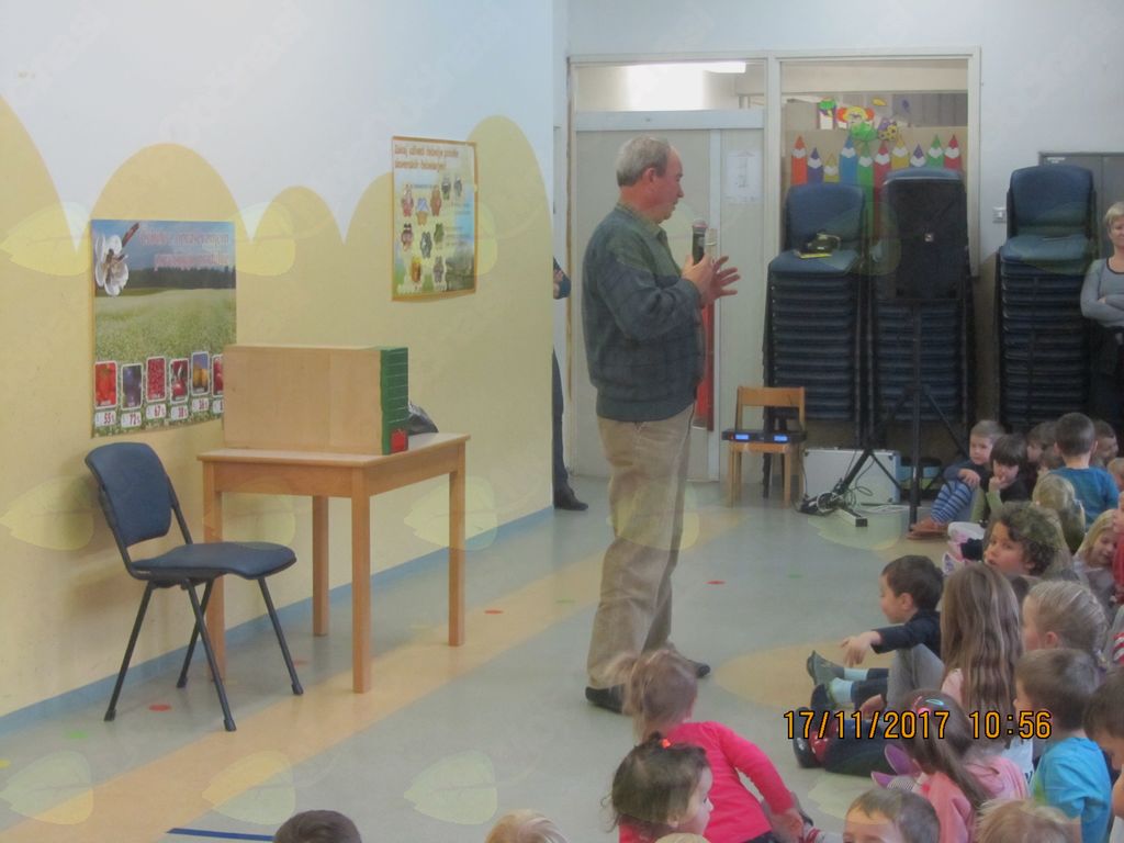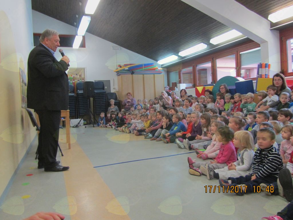 Ob 10. uri smo se vsi skupaj zbrali v vrtčevski telovadnici, kjer smo zapeli Slakovo – Čebelice. Za glasbeno podlago harmonike je poskrbel Sarin oče Miran Pavunc, s petjem pa smo jo podkrepili otroci in zaposleni. V goste pa smo povabili tudi gospoda župana Berta Menarda, ki nam je namenil nekaj besed o tradicionalnem slovenskem zajtrku in čebelarja gospoda Janeza Nagodeta, ki nam je predstavil čebele in njihovo življenje. Otroci so ga veliko spraševali in ga z zanimanjem poslušali.