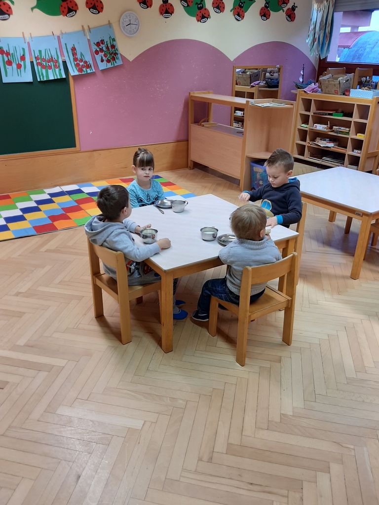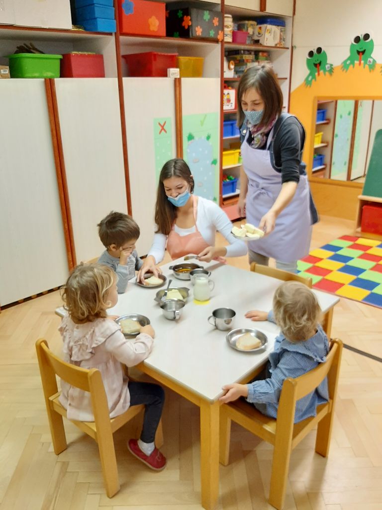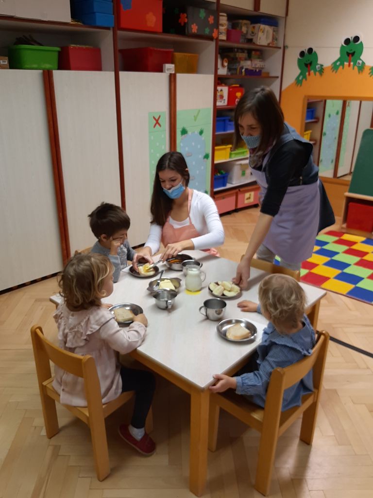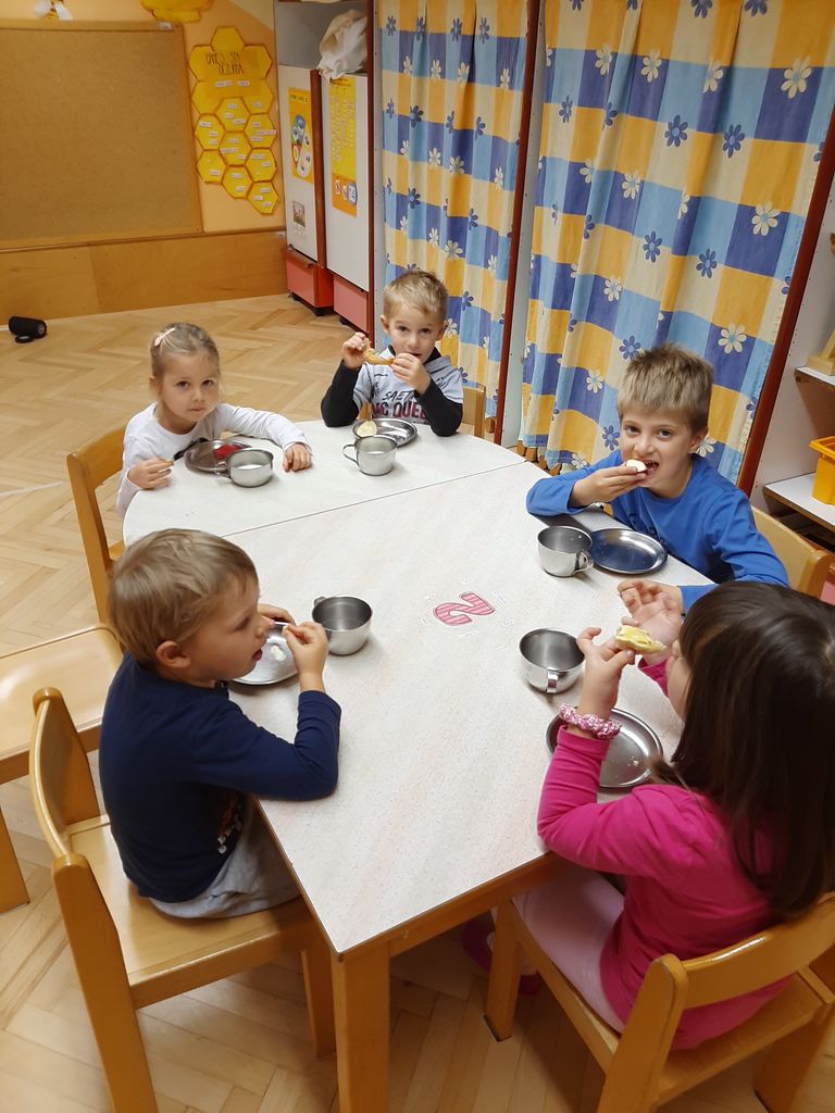 Posladkali smo se z medom logaških čebelarjev, domačim mlekom, maslom, kruhom iz kmetije Fečur in domačimi jabolki. Ob odličnem zajtrku smo poslušali pesmico »Leti moja čebelca«, potem pa smo si ogledali še film o čebelicah! Vemo, da moramo uživati čim več domače hrane, da bomo zdravi, veseli, tako bomo poskrbeli za čisto okolje in ohranili kmetije. To je dan, ko se sprašujemo od kod dobimo hrano, kaj jemo, kako pomemben je zajtrk.