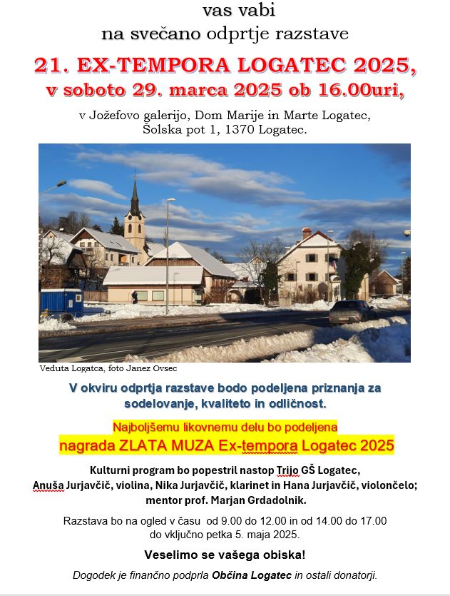 V soboto 29.marca 2025 se je v Jožefovi galeriji Doma Marije in Marte Logatec, z odprtjem razstave in podelitvijo nagrad in priznanj uradno zaključil 21. likovni ex-tempore Logatec 2025.