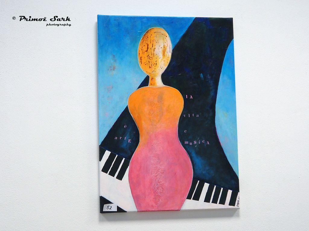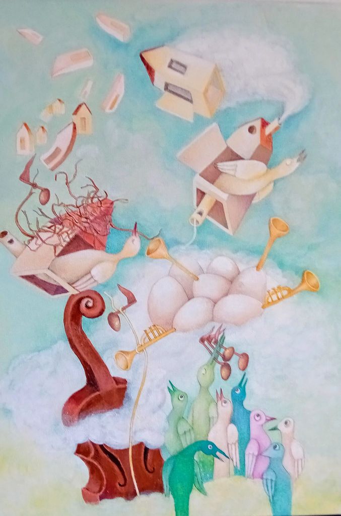 Kompozicija je dinamična, njeni elementi so razpršeni in dajejo celo občutek razpadanja ene vsebinske gmote, ki se nato poveže v trdno, domišljijsko, po pristopu nadrealistično in zelo osmišljeno celoto. Avtorica se poslužuje ilustrativnih elementov, naredi vez z naravo in glasbo. Ilustrativnost pa preseže in tako njena stvaritev ni ilustracija. Vsebinsko bogat motiv prekipeva v radoživosti. Odlikuje ga jasnost oblik in barvna občutenost.