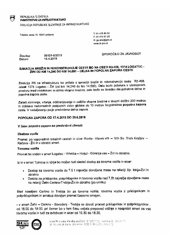 Direkcija za infrastrukturo bo pričela s sanacijo brežnin in rekonstrukcijo ceste R2-408 odsek 1374 Logatec - Žiri (od 14,240 do 14,580 km). Dela bodo potekala v utesnjenem prostoru med vodotokom in strmo vkopano brežnino, zato bodo za izvedbo del potrebna delna in popolna zapora ceste.