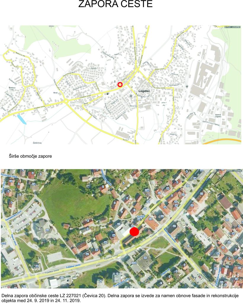 Delna zapora občinske ceste LZ 227021 (Čevica 20). Delna zapora se izvede za namen obnove fasade in rekonstrukcije objekta med 24. 9. 2019 in 24. 11. 2019.