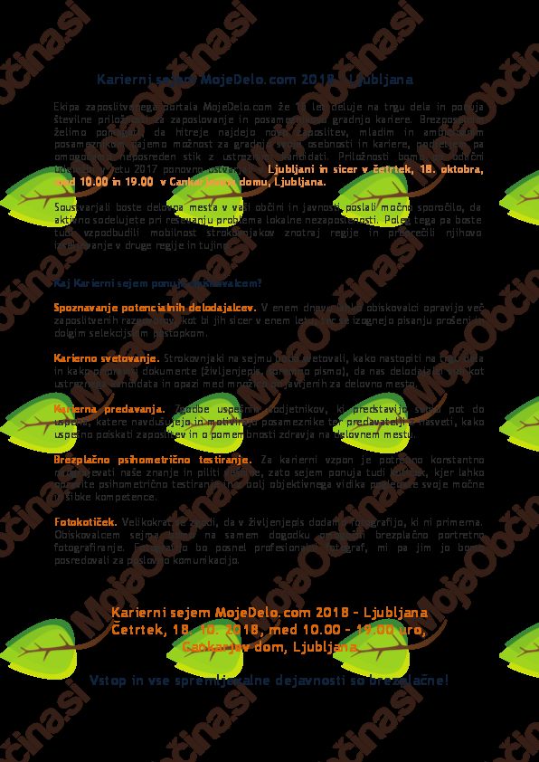 V Ljubljani bo med 10. in 19. uro v Cankarjevem domu potekal Karierni sejem MojeDelo.com 2018 - Ljubljana. Več preberite v prilogi. Lepo povabljeni!