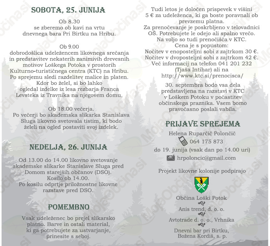 V organizaciji turističnega društva Loški Potok, bo 25. in 26. junija v Loškem Potoku že 13. likovno srečanje in 4. likovna ustvarjalnica. Tema letošnjega ustvarjanja so drevesa.