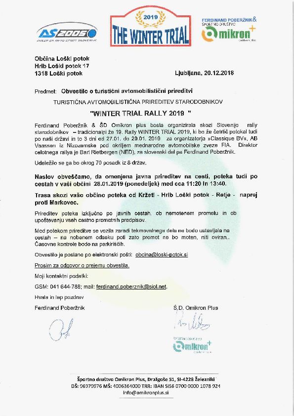 V ponedeljek, 28. januarja 2018 bo skozi občino Loški Potok potekala turistična vožnja starodobnikov WINTER TRAIL RALLY 2019. Predvidoma bodo starodobniki skozi našo občino vozili med 11.20 in 13.40 uro. Trasa poteka od Kržetov (v občini Sodražica), skozi Hrib-Loški Potok - Retje - proti Markovcu (v občini Loška dolina).