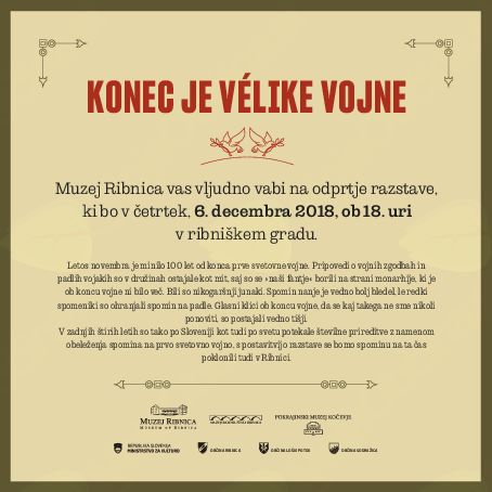 Muzej Ribnica vas vljudno vabi na odprtje razstave, ki bo v četrtek, 6. decembra 2018, ob 18. uri v ribniškem gradu. Razstava je pripravljena v spomin na 100. obletnico konca 1. svetovne vojne. Lepo vabljeni!