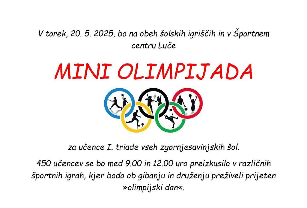 Vabljeni, da se nam pridružite na prav posebnem športnem dogodku – Mini olimpijadi, ki bo potekala v torek, 20. maja 2025, v Lučah! Mini olimpijada je nacionalni projekt Olimpijskega komiteja Slovenije, katerega namen je, da otrokom na igriv in zabaven način predstavi šport ter spodbuja vrednote, kot so prijateljstvo, spoštovanje in odličnost.