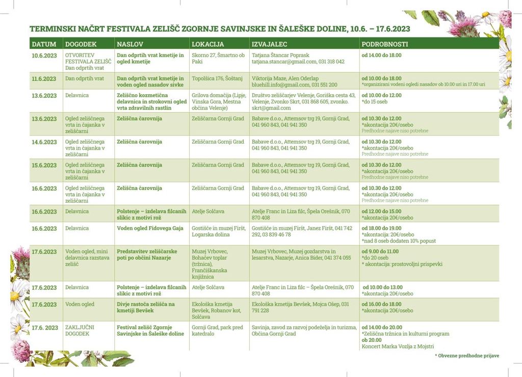 Pričnemo to soboto, 10. 6. 2023 na Ekološki kmetiji Tatjane Štancar Poprask z dnevom odprtih vrat in ogledom kmetije. Nadaljujemo v nedeljo, 11. 6. 2023 z dnevom odprtih vrat kmetije in vodenim ogledom nasadov sivke pri Viktoriji Maze in Alenu Oderlap. Dogodki si sledijo še cel teden do zaključnega dogodka, ki bo tokrat v Gornjem Gradu, 17. 6. 2023.