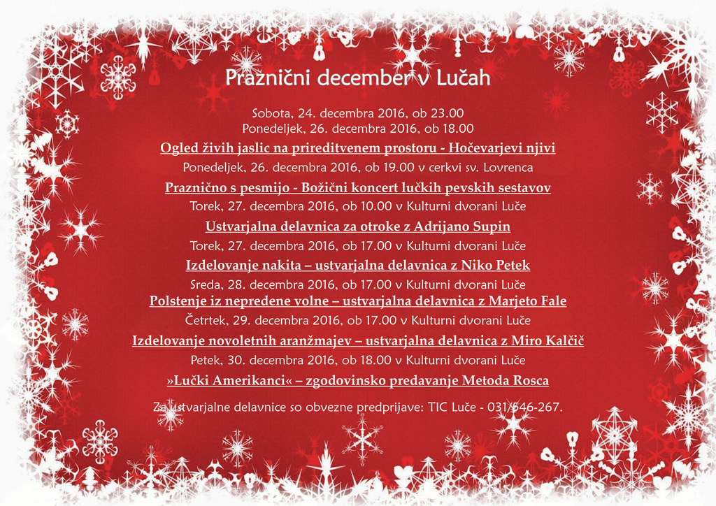 Vabljeni na zanimive dogodke in ustvarjalne delavnice, ki se bodo odvijali med 24. in 30. decembrom 2016, v okviru prazničnega decembra v Lučah.