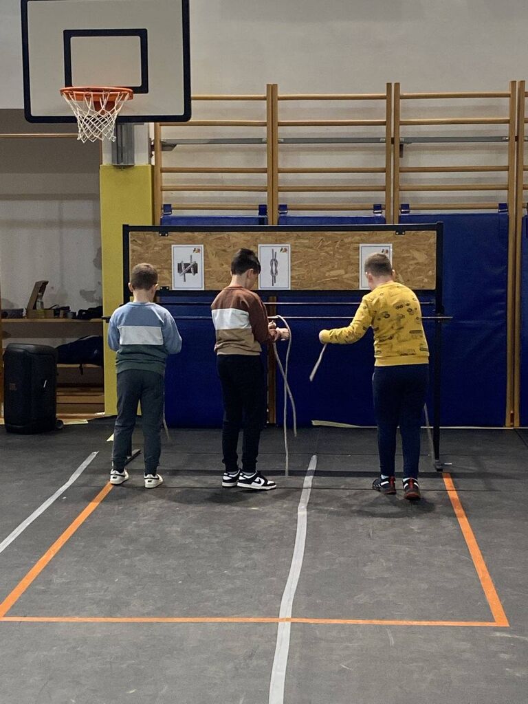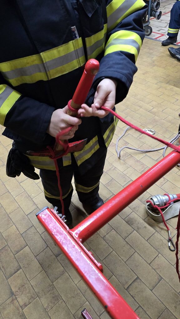 Naslednji četrtek smo postavili lestev, jo privezali in se povzpeli po njej. Na vrhu smo se na lestev privezali, morali pa smo nenehno paziti, da smo bili vsaj na treh točkah naenkrat na lestvi. Potem smo se preizkusili še v navezavi orodja.