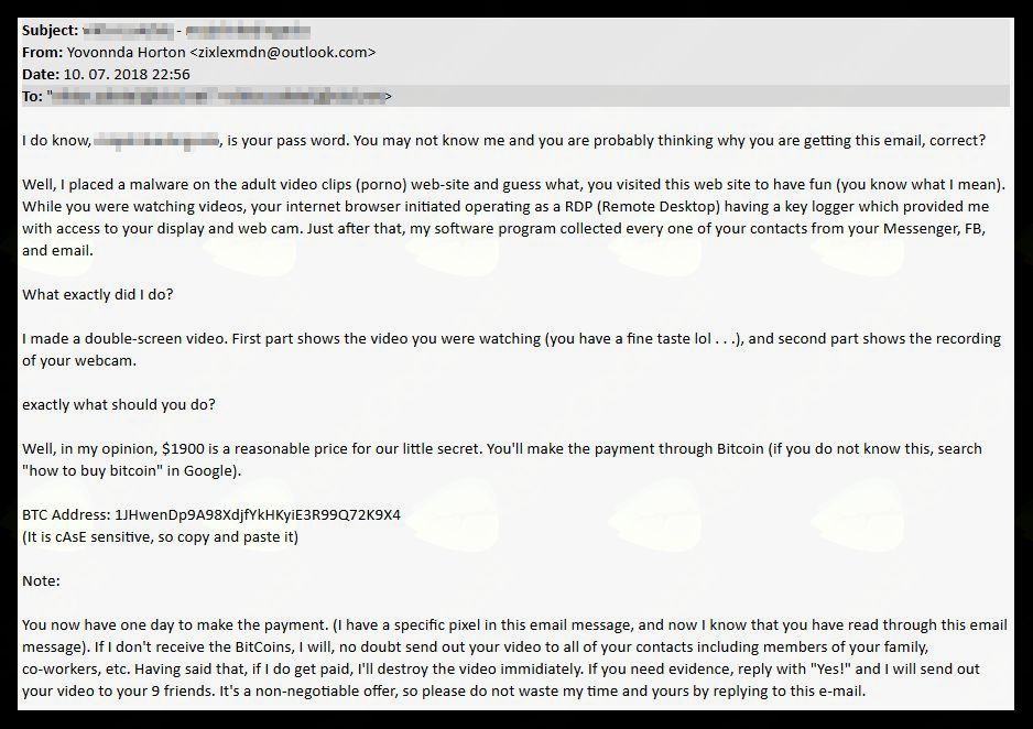 V teh primerih neznani pošiljatelj v svojem elektronskem sporočilu v angleščini navaja, da je okužil računalnik prejemnika z zlonamerno programsko opremo (virusom). Virus naj bi deloval tako, piše neznani pošiljatelj, da omogoča uporabo oz. vklop prejemnikove kamere, ki naj bi prejemnika posnela med gledanjem spletne strani z erotično vsebino. V nadaljevanju sporočila pa pošiljatelj še grozi, da bo te posnetke odposlal vsem prejemnikovim kontaktom, če mu prejemnik ne bo plačal. Pri tem običajno zahteva plačilo v obliki virtualne valute bitcoin.