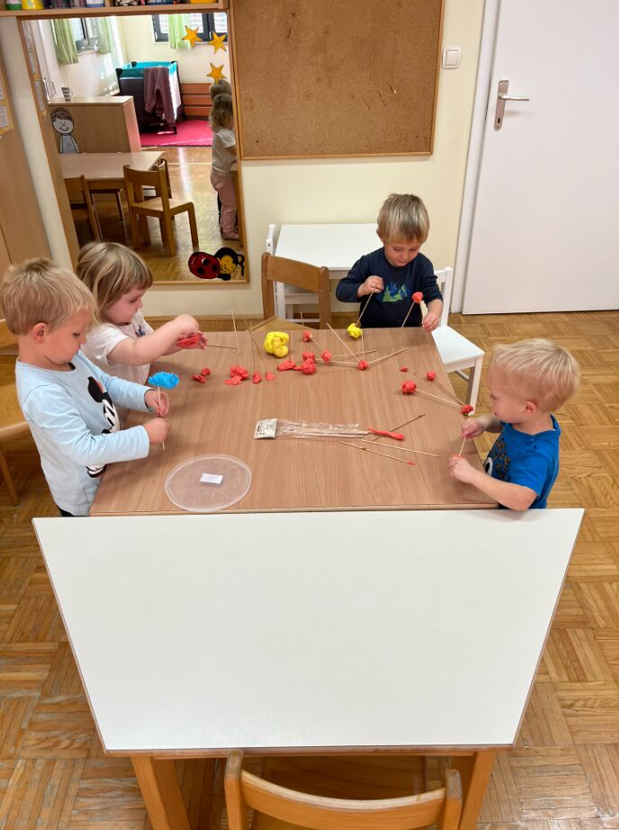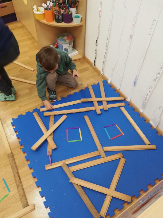 Otroci starejših skupin so raziskovali kozolce. V revijah so iskali podobne objekte, jih opisovali in primerjali. Z ogljem so risali načrt kozolca in ga izdelali iz lesenih palčk. Preko pravljične joge so spoznali zgodbo arhitekta in arhitektke in se seznanili z tem poklicem. Preko gibanja so urili ravnotežje in domišljijo ter se vživeli v vlogo graditeljev in oblikovalcev prostora.