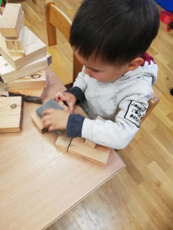 V drugi skupini starejših otrok pa so otroci gradili iz različnih materialov, lesenih kosov, palic, desk in gline. Pri tem so preizkušali trdnost in stabilnost. Tipali, presipali in raziskovali so žagovino in spoznavali njeno strukturo. Preizkusili so se tudi v brušenju lesa z brusnim papirjem. Tako so neposredno izkusili delo z naravnim materialom, ki je bil nekoč vključen pri gradnji in izdelavi hiš. Igrali so se gibalne igre Ptički v gnezda, Psički v utice, ki so se igrivo navezovali na temo domovanja in gradnje ter razvijali orientacijo v prostoru, hitrost in sodelovanje.