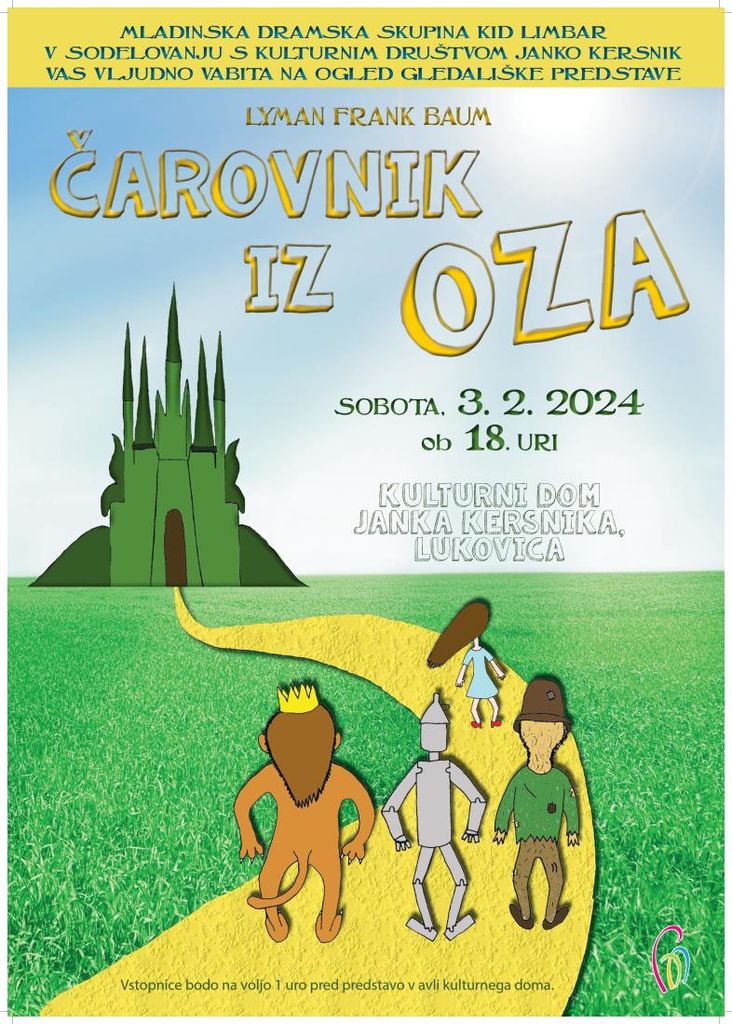 Pripoved o Dorotejinih dogodivščinah, ki jo je napisal ameriški avtor Lyman Frank Baum, danes uvrščamo med klasike. Prvič je bila objavljena leta 1900 in tako že več kot stoletje navdušuje mlade in tudi starejše bralce. Ko ju skupaj s hišo odnese hud tornado, se deklica Doroteja znajdeta v neznani deželi. V želji po vrnitvi v rodni Kansas se Doroteja po poti, tlakovani z rumeno opeko, odpravi do Smaragdnega mesta, da bi našla velikega čarovnika Oza, ki bi ji pomagal poiskati pot domov. Na pustolovščini polni magije, prijateljstva in številnih neznanih bitij, se ji pridružijo ptičje strašilo brez pameti, kositrni drvar brez srca in strahopetni lev brez poguma. V predstavi nastopa 40 mladih.