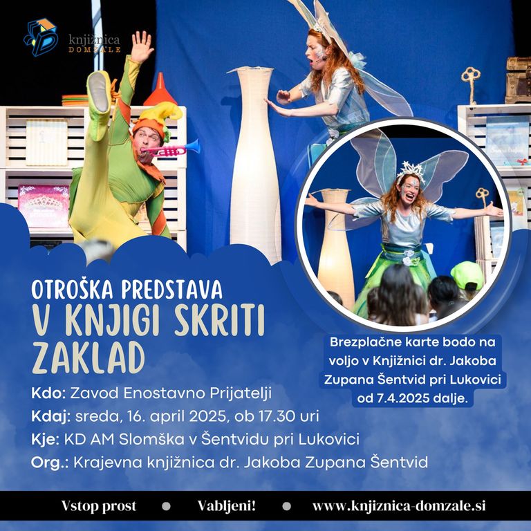 V sredo, 16.04.2025, bo ob 17.30 v Kulturnem domu Antona Martina Slomška v Šentvidu pri Lukovici otroška igrana predstava V knjigi skriti zaklad. Predstavo organizira Knjižnica Domžale, Krajevna knjižnica dr. Jakoba Zupana Šentvid pri Lukovici. Predstava govori o pravljični vili, ki otrokom pripoveduje pravljico o škratku Tinku Pobalinku. A ko obrne prvi list, Tinko skoči iz knjige, ker ne želi, da vila bere pravljico o njemu. Tinko namreč trdi, da so pravljice dolgočasne in da je veliko bolj zanimivo od branja delanje neumnosti. Otroke skuša potegniti na svojo stran, a še predenj bi se utegnili naučiti kakšne neumnosti, vila prevzame stvari v svoje roke. Z malo čarobnega prahu v pravljično deželo pričara zaklad, v katerem pa se ne skrivajo denar, zlato in bomboni, ampak nekaj, kar Tinka Pobalinka za vedno spremeni.
