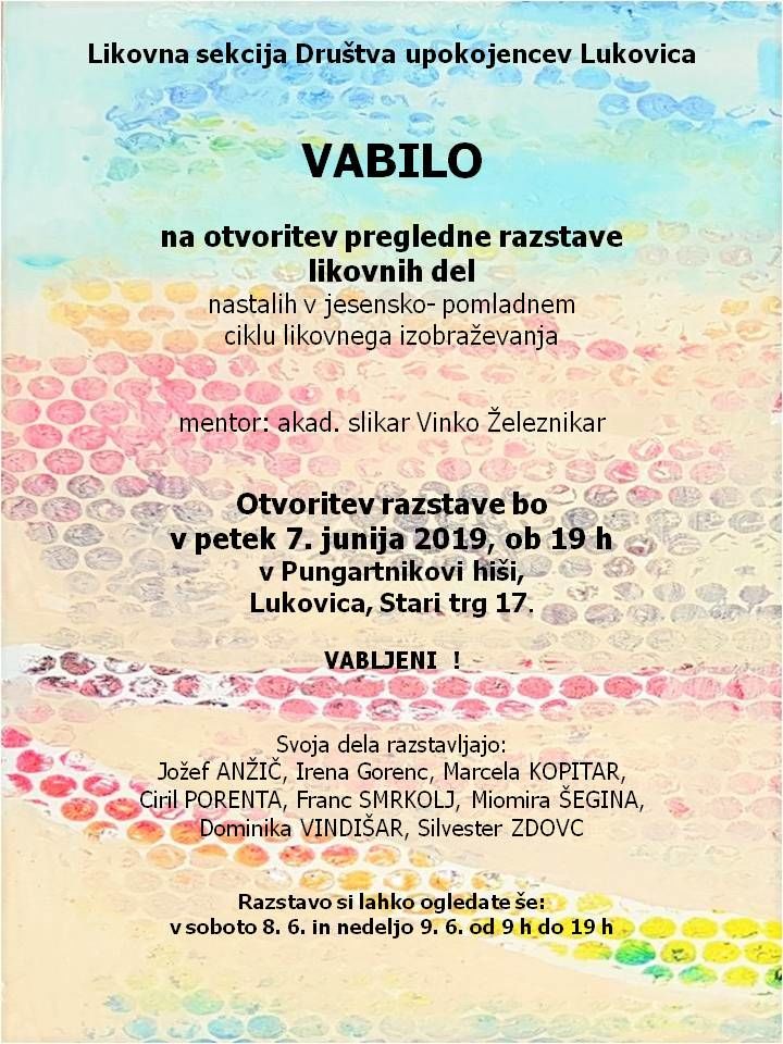 Člani likovne sekcije DU Lukovica se ob pomoči mentorja, akademskega slikarja Vinka Železnikarja, izobražujemo v različnih likovnih tehnikah, mentor pa nas tudi usmerja v razmišljanje o tem, kako tisto, kar vidimo, ponotranjiti in nato to prenesti v obliki likovnih elementov na slikovno podlago. Ker smo ljudje unikati, vsak stvari drugače vidi in drugače doživlja, zato so likovni izrazi vsakega posameznika lahko zelo različni. Lahko izhajajo iz videnega ali pa samo iz občutkov.