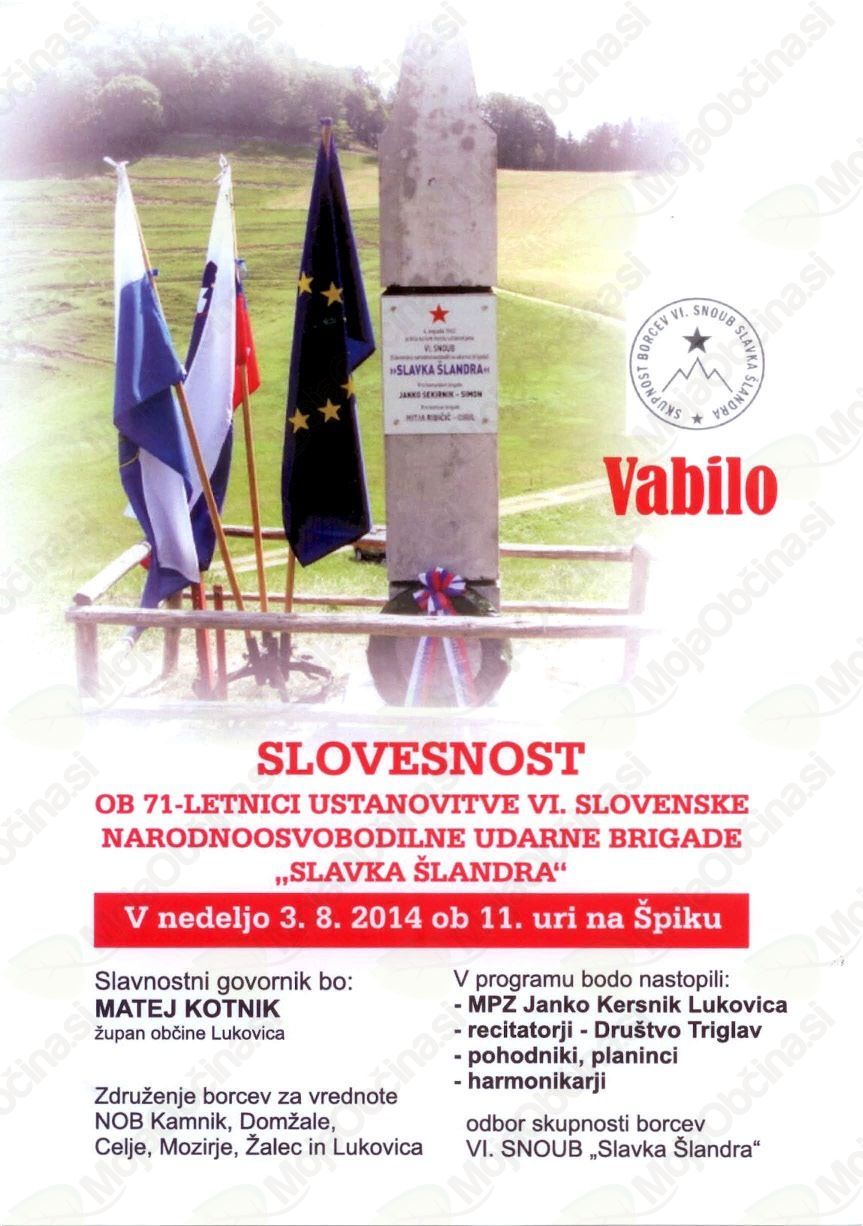 Občinsko združenje borcev za vrednote NOB Lukovica vabi na slovesnost ob 71 – letnici ustanovitve Šlandrove brigade
