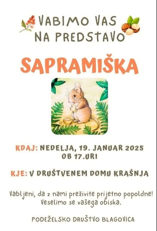 Z veseljem v našem društvenem domu gostimo naše bližnje sosede in vas vabimo, da skupaj z nami popoldne 19. januarja v Društvenem domu v Krašnji preživite v družbi Sapramiške v izvedbi članic in članov Podeželjskega društva Blagovica. Ob tem ne pozabite, da Sapramiška dokazuje, da lahko otroke pritegnejo tudi manj popularne stvari kot je sodobna tehnologija, zato naj vas vaši otroci in vnuki le pripeljejo na ogled Sapramiške v nedeljo v Društveniu dom v Krašnjo.