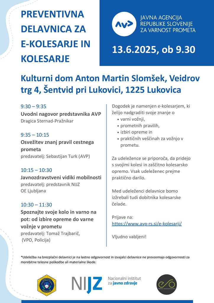Dogodek je namenjen E-kolesarjem, ki želijo nadgraditi svoje znanje o varni vožnji, prometnih pravilih, izbiri opreme in praktičnih veščinah za varno vožnjo v prometu. Priporoča se, da pridejo udeleženci s svojimi kolesi in zaščitno kolesarsko opremo . zažečljene so piajve niso pa obezno kontak za prijavo najdete na vabilu. Vabita Policija in NIJZ