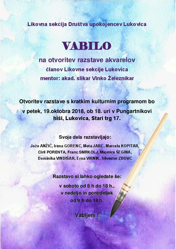 Člani Likovne sekcije Društva upokojencev Lukovica vas vabimo na razstavo akvarelov, ki smo jih v tem letu ustvarjali pod vodstvom našega mentorja, akademskega slikarja Vinka Železnikarja.