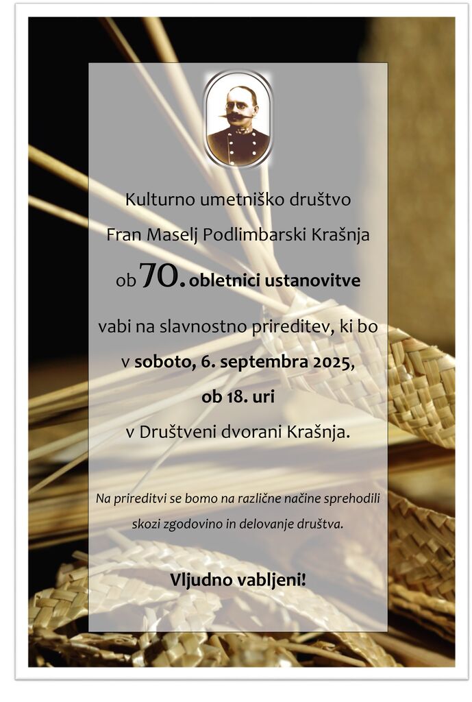 KUD Fran Maselj Podlimbarski vabi na slavnostno prireditev ob 70 letnici društva. Na prireditvi se bodo sprehodili čez bogato zgodovino in delovanje društva na različne načine. Spomnili se bodo na prvem mestu dolga leta gonilne sile društva Vere Beguš in številnih drugih, ki so ustvarjali in še ustvarjajo, da društvo živi in diha v kraju bogatem s kulturo. Zato vljudno vabljeni v Društveni dom v Krašnji v soboto 6. septembra ob 18. uri . Pokrovitelj prireditve je Občina Lukovica.